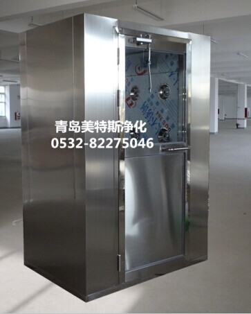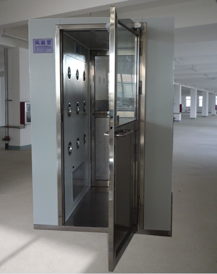 風淋室是人/貨進入潔凈室所必須通道,起到氣閥室密閉潔凈室的作用??梢詼p低人/貨進出潔凈區(qū)所帶來的污染問題。為了減少由于人/貨進出所帶來的大量塵埃粒子,經(jīng)過高效過濾后的高速潔凈氣流由可旋轉噴射至人/貨上,有效而迅速的清除人/貨從非潔凈區(qū)所帶來的塵埃粒子及細菌。