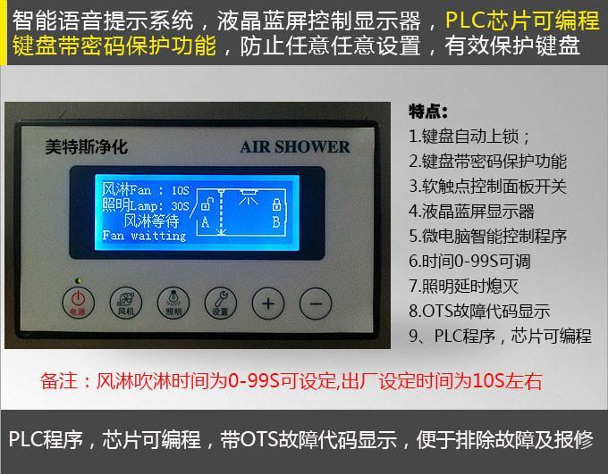 PLC系統(tǒng),控制面盤軟觸點控制開關,智能語音提示功能,LED顯示:風淋時間,照明,內(nèi)外門,內(nèi)設”急停”按鈕。緊急情況下按下按鈕,系統(tǒng)斷電雙門可同時打開